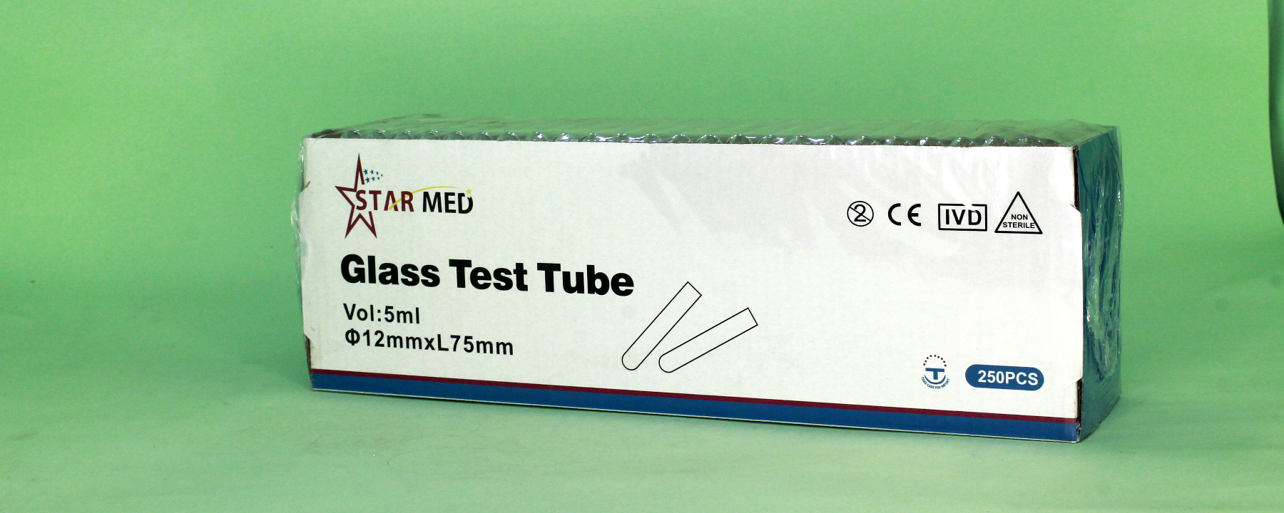 Clear glass test tube used in laboratories for sample preparation or storage. Size: 12x75mm, Volume: 5ml, Non-sterile
