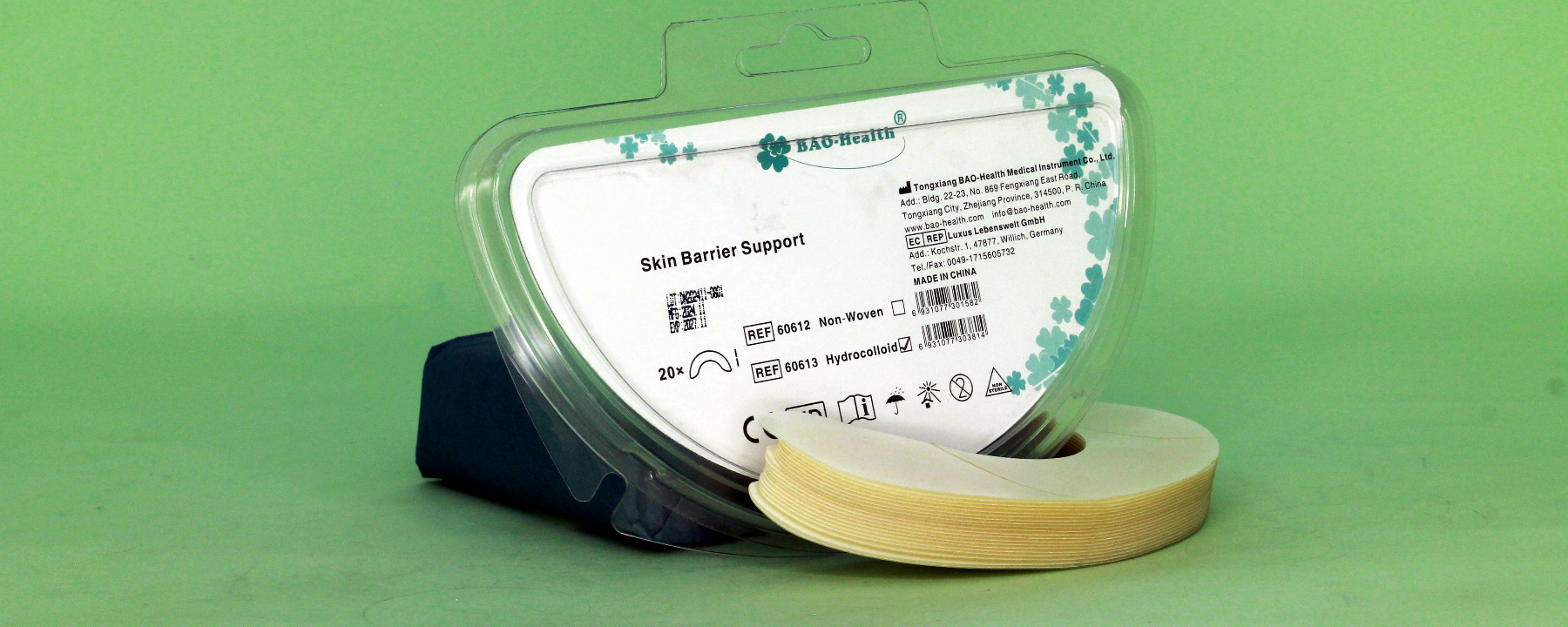 Crescent-shaped skin barrier support used with colostomy bags to enhance adhesion and minimize leakage. Skin-friendly and easy to apply. Made in China