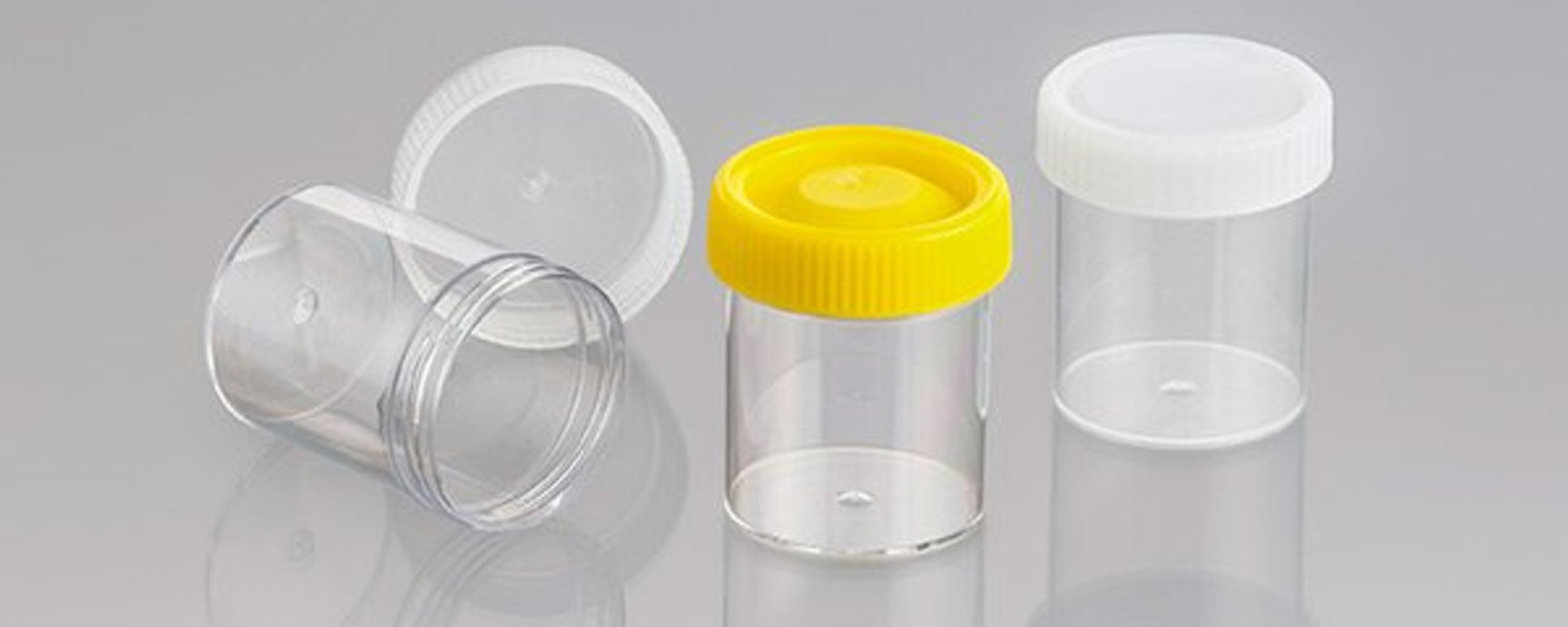 Container designed for urine sample collection. Made of medical-grade plastic with a screw cap to prevent leakage. Comes with printed graduations and a label for patient information. Ideal for hospitals and laboratories